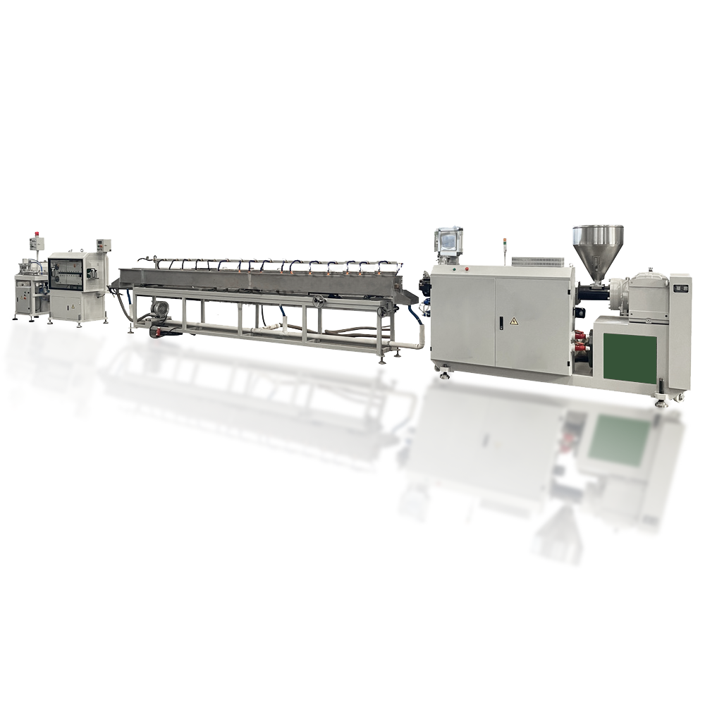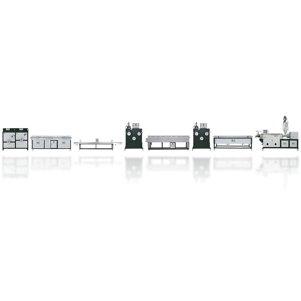 This production line includes all the configurations of an Universal Profile Extrusion Line, including the main extruder, cooling system, traction system, storage system, and various additional auxiliary machines.